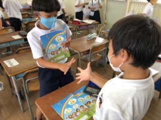 覗いてみると、何やらゲームらしきことをしています!話す相手を見つけて、英語でジャンケンをして、相手のリンゴの数を英語で聞きます!自分の数と同じならOK!子どもたちは、次から次に相手を替えていきます!みんなとても楽しそう!英語は使って、通じて、わかるとますます話したくなりますね!どんどん使っていきましょう!