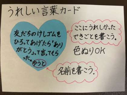 ハート型の用紙に書いて、みんなの言葉を集めます!どんなことを言われたときがうれしかったのか!どんな言葉やできごとが集まるのか!今からワクワク楽しみですね!
