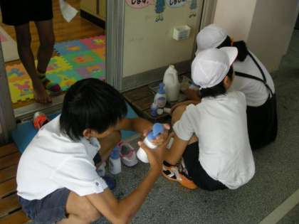 9月10日(火) 運動会の練習が校舎に響くようになりました。運動会の練習や準備で忙しく取り組む合間を「保健委員会」の子ども達は手洗い石けんの詰め替えをしてくれています。外での活動が続くこの時期、手洗いはとても大切です。保健委員の子ども達が支えてくれていました。