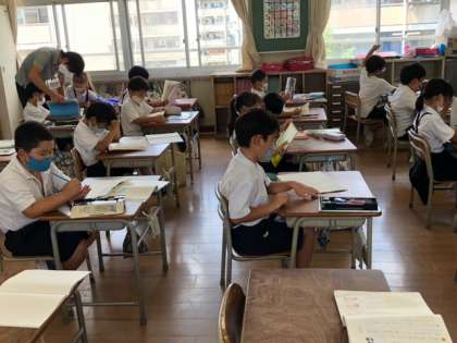 前の机に何人かが集まって、お題を書き写しています。ある絵について、言葉で説明をして伝える学びです。