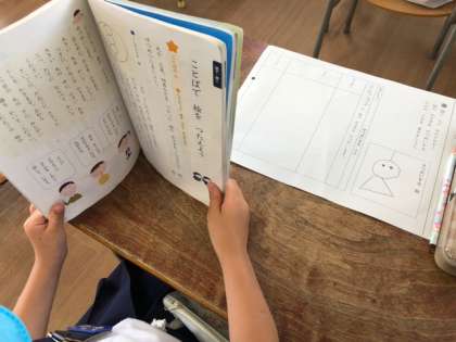 「ことばでえをつたえよう!」の単元です。説明文への導入の学び。子どもたちは、はじめ!なか!おわり!の3つの箱に言葉をつなげていきます!