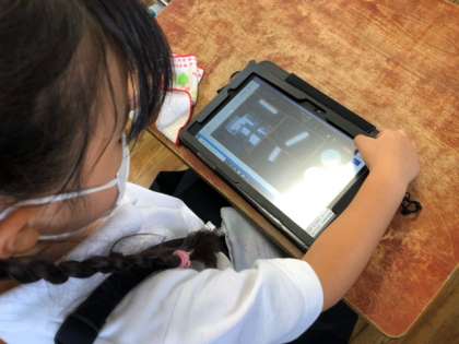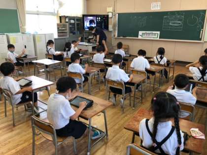教室には先生が1人!子どもたちはとなりの部屋で、タブレットの奥の先生と話します。