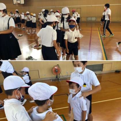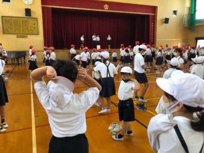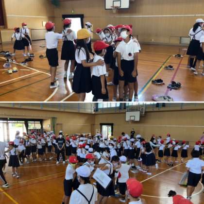 体育館ではスマイル集会が行われていました。今日のゲームは「じゃんけん列車の負けたら勝ちゲーム」