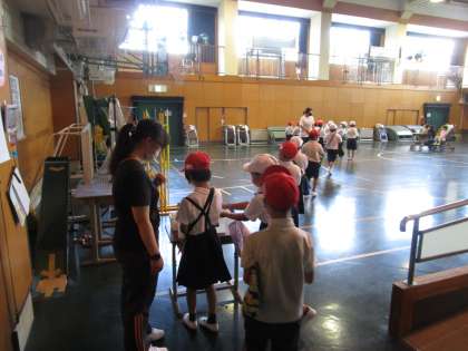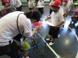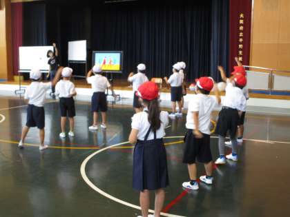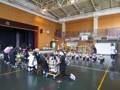 7月7日(木)、2年生は平野支援学校との交流がありました。到着し、消毒してから体育館であいさつをしました。担当の先生が、今日の流れについて説明してくださいました。まずは、みんなで「エビカニクス」という体操をしました。