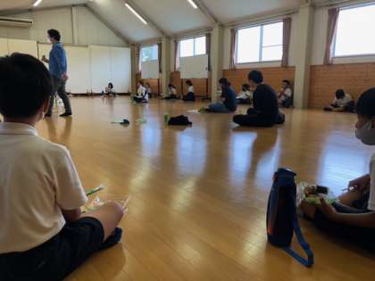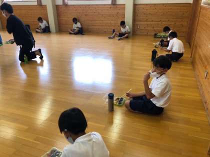 多目的室に輪になって広がり、お弁当をいただきます!ここでも黙食忘れません!