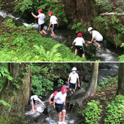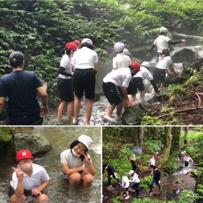 魚をいただいた後は、沢登りにチャレンジしました!何度も挑む子どももいれば、恐る恐るでも必死に挑む子どももいて、大阪では体験できない時間を満喫しています!雨模様ですが、子どもたちの笑顔と歓声が雨を吹き飛ばしています!