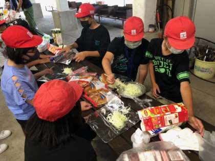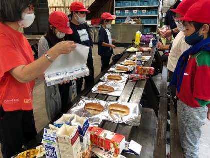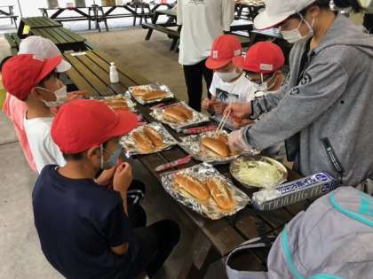 「カートンドックづくり」です!ホットドックを1人2本!キャベツにウインナーを具材に、おいしい朝食をつくります!