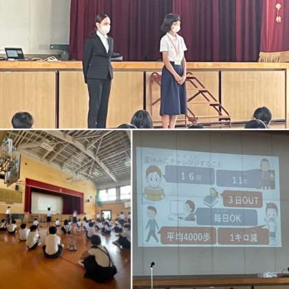 次に夏休みを振り返り、「私のチャレンジ6」の結果を発表しました。結果は3勝3敗でした。悔しいけれど、それよりも目標を持ってチャレンジし続けた自分をほめたい!できる?できない?と考える前に、とにかく動くことの大切さを伝えました。