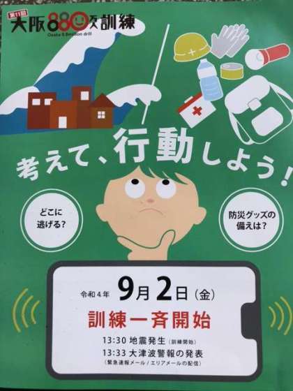 本日は「大阪880万人訓練」が午後1時30分に一斉開始されました。