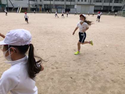 台風一過の運動場にはさわやかな風が流れます!その中を颯爽と子どもたちが駆け抜けていました!