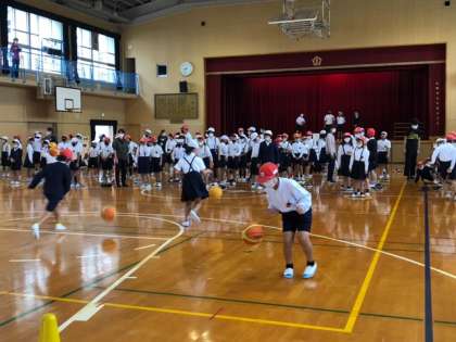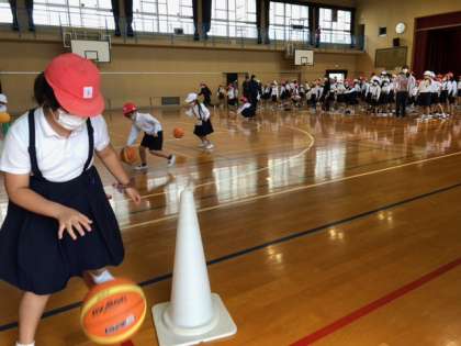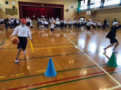 巧みにドリブルする子どももいれば、苦手な子どもは持ちながら前に進みます!みんなが勝ち負けに拘らず、楽しく過ごす時間が流れました!みんな!いい笑顔してましたよ!