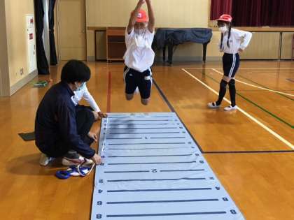 ドッジボールで汗を流す子どもたち!その脇では、1人ずつ立ち幅跳びにチャレンジしています。