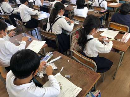 アルミホイルが1人ひとつ配られています。子どもたちは思い思いにアルミホイルを引っ張り出して、何かの形をつくっています!