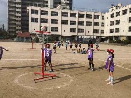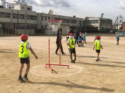 子どもたちはチームに分かれて、競い合います。高さも低く、点数も入りやすく、白熱したゲーム展開でした。