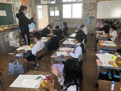子どもたちは紙を使って、まゆげや目、鼻などを表現しています。