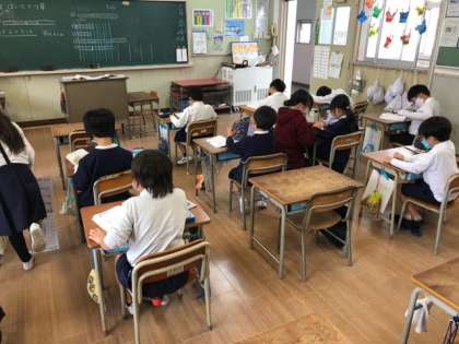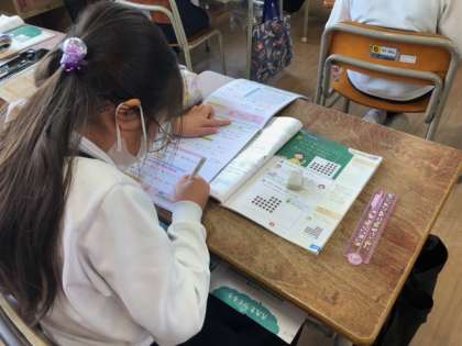 テープ図を使いながら、もとの数の何倍になるかを考える子どもたち。教科書の図とにらめっこです!もとになる数、そのいくつ分、この考え方はこの先も大切なポイントになりますね!自分の世界で集中する子どもたちでした!