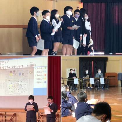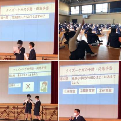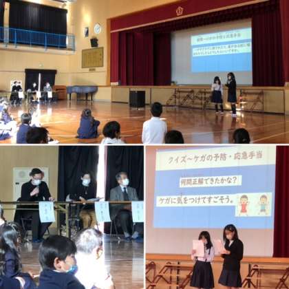テーマは「ケガの予防と対処法」です。健康委員会のみなさんのプレゼンテーションがみんなの関心を引きつけました。学校で起こるケガの種類や場所、もしもの時にどうすべきか!また、クイズも交えてわかりやすい説明でした!よかったよ!