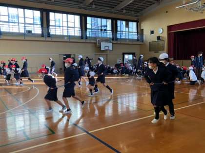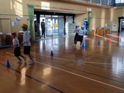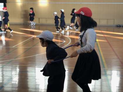 今朝のゲームは「フラフープリレー」です!たてわりのペアでフラフープに入り、リレーで競い合います!