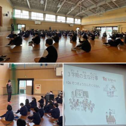さあ!あとは前に進むだけ!今学期は次の学年の「0学期」とも言います。まとめと準備をしっかりとして、寒さに負けず、コロナに負けず、自分の命を大切にして過ごしてください。また、生活指導の担当からは、イラストキャラクターを使って生活習慣の改善について伝えました。これも自分の命を守る大切なことです。
