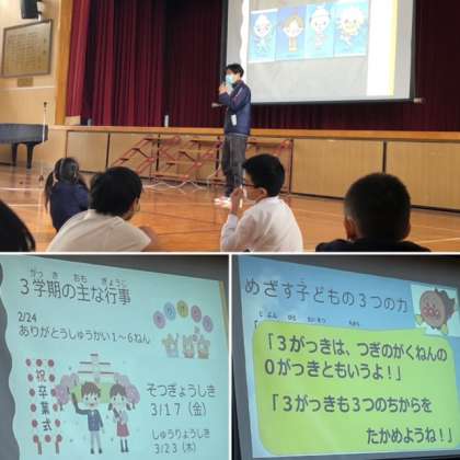 さて、新学期も「3つの力」を心に誓うスタートでした!まずは3学期の主な行事について確かめ合いました。「卒業遠足!社会見学!出前授業!漢字検定!授業参観!ありがとう集会!卒業式!修了式」と続きます。そして、今学期「自分が高めたい力」を決めました!