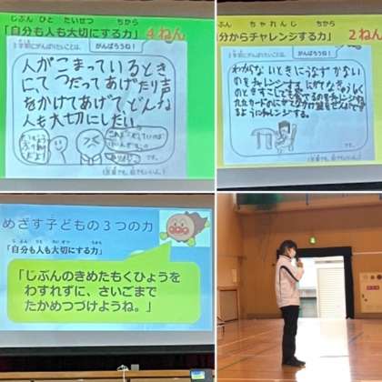 学習のこと、スポーツのこと、友達とのこと、家でのこと、習い事のことなど、それぞれにめざす目標がありました。何人かの子どもたちのなりたい自分の姿をみんなで共有しました。