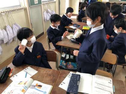 紙コップと糸を使って、「糸電話づくり」にチャレンジする子どもたちです。