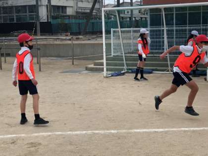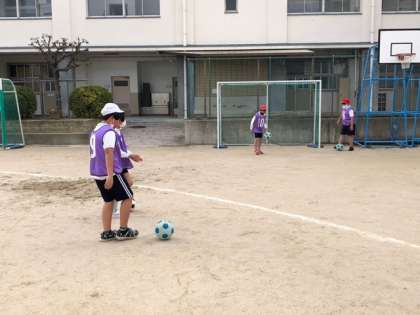 風が冷たい運動場では、子どもたちがサッカーの学びを楽しんでいました。