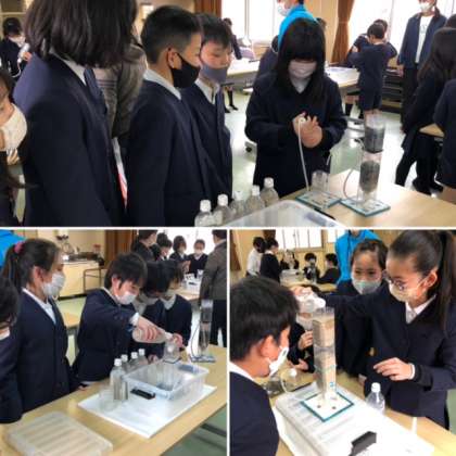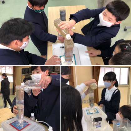 次に汚れた水をきれいな水にしていく実験です。グループで力を合わせて実験を進めます。きれいになった水に子どもたちは驚いていました。微生物も匂いも色も取り除いていく様子に浄水場の仕組みを感じることができました。安心で安全な水の宝庫である日本の技術はすばらしいです!