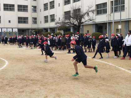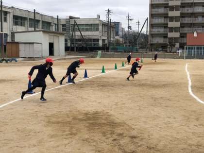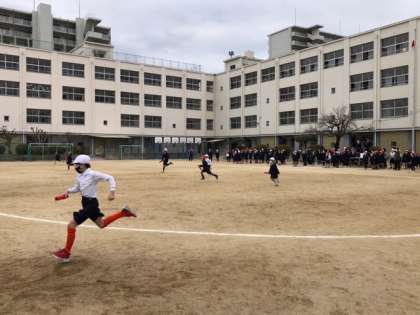 運動場を使って、コーンをまわってバトンリレー!寒い中、みんな元気に走りを楽しんでいました。
