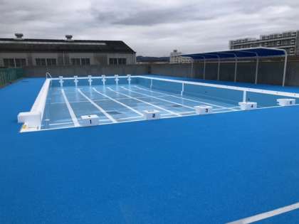 プールサイドが青々と大変身していますあ!これまでのコンクリートから、優しい素材のシートに大きく生まれ変わります。極端に熱くならず、居心地が良くなります。水泳の時期が楽しみですね!