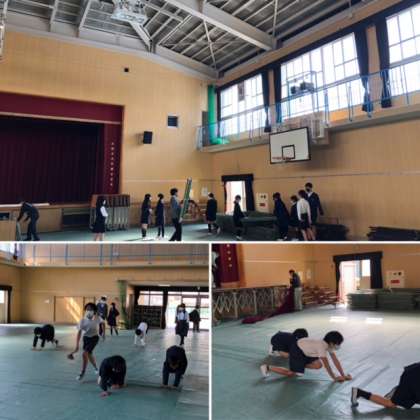 体育館ではサブリーダーのみなさんが力を合わせて、卒業式のためのシート引きをしています。