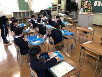 お道具箱を出して、お手紙を確かめて、どこに何を入れる?と考えながら、先生のお話をしっかりと聞く子どもたち。