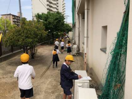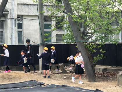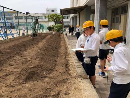 校庭に広がって、探しものをする子どもたち。虫や花、木々などなど、目についた気になるものを見つけて、記録していきます。途中、管理作業員さんたちが、学習園の畝作りに汗を流していました。お見事な鍬さばき!!