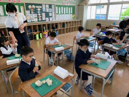 子どもたちは粘土遊びに夢中です。手先を使うことは脳の発達にもとても効果があります。