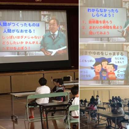 まずは体育館にてロケットの発案者である「植松電気社長の植松努さんからのビデオメッセージ」です。