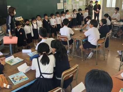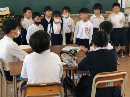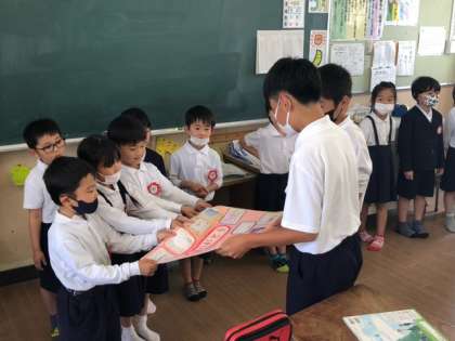1年生の子どもたちがリーダーである6年生の教室まで行き、道徳で学んだ「感謝を伝える」学びをしました。