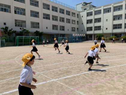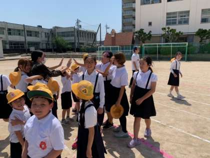 お昼休みに運動場に出ると、5年生の子どもたちが1年生の子どもたちと一緒に遊んでいました。