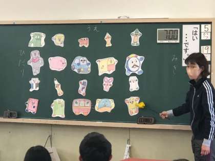先生の手作りイラスト用紙を使って、子どもたちは位置関係についての学びをしています。市販のものではなく、手作りすることで、温かみがあり、子どもたちの興味を惹きます。どの子どもも意欲的に学習に向かっていました。