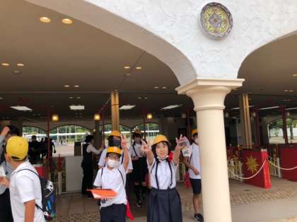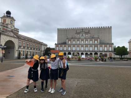 ハイポーズ!記念写真後はグループ活動スタートです!おや?雨が来た!それでも子どもは雨具でチャレンジ!