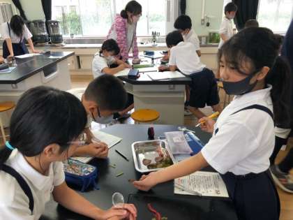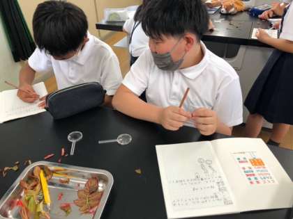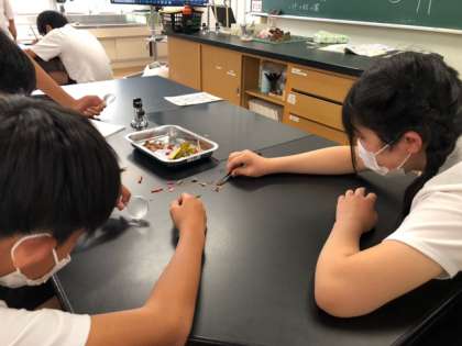 茎の繊維の細かい部分にまで神経を集中させて観察します。色をつけることによって、その道筋がわかります!