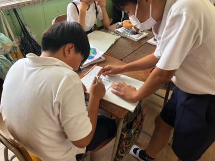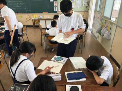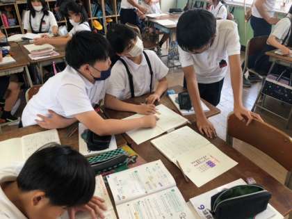 分数の割り算にチャレンジする子どもたち!友だちに教え、教えられ、学びを深める子どもたち。学び合いは教える側にも「学び直し」という大きなメリットがあります。自分がわかっても、それを人に教える時にうまく教えられないや相手にわかってもらえないと、真にわかったとは言えません。だからこそ、学び合いにはお互いの教育効果があるのです。