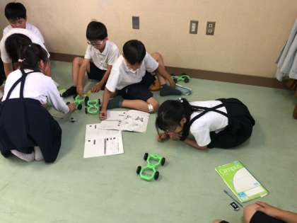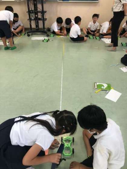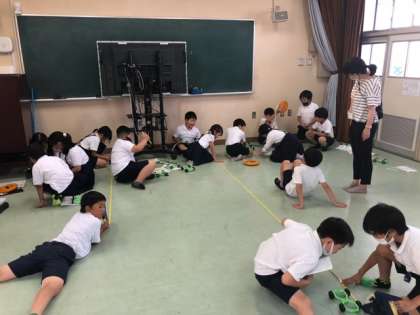 子どもたちはひっぱった長さと車の動いた距離に注目しながら学習を進めていました!ついつい走らせることに夢中になり過ぎてしまう子どもも!仕方がないですよね。子どもは遊びの中からたくさんのこと
