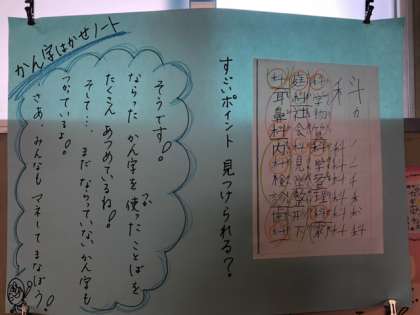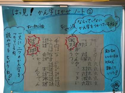 また教室の掲示物には、子どもたちのすてきなノートが紹介されていました。自学の様子にポイントごとにコメントが入っていて、学びを広げる手立てがありました。友だちの学びから自分の学びを広げる子どもたちです。