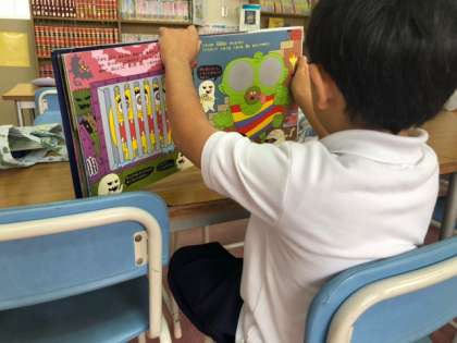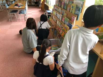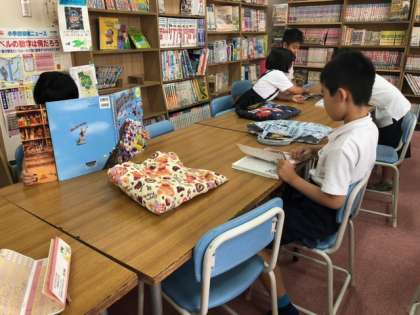 図書館では子どもたちが本の世界に浸っていました。今、蔵書管理はすべてバーコード化しており、一括管理ができます。子どもたちは読みたい本を事前予約できます。どうしても人気の本にはリクエストが集中するようで、子どもたちは互いに譲り合いながら、本を楽しんでいました。
