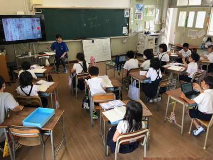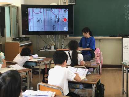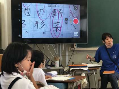 教室の大型モニターには、子どもたちの漢字ノートが映し出されていました。