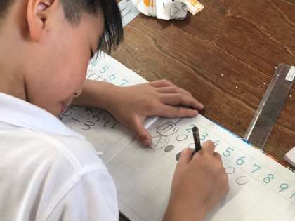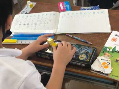 子どもたちがノートに上手に○や●を書き込んでいます。ブロックも使って、二つの数の違いについて学びます。