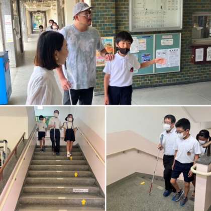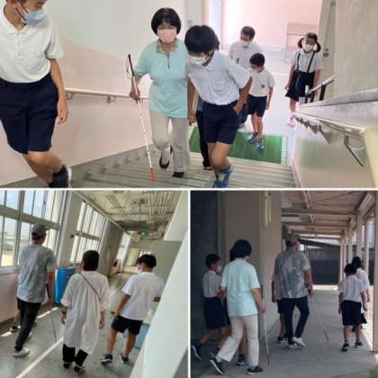 子どもたちは実際に介助者となり、校内をともに歩きました。ふだんは当たり前のように歩く廊下も、階段も、目の不自由な方とともに歩くことで、新しく見えてくるものがあります。バケツやマット、段差や手すりなど、困らないようにどう誘導すればいいのか?声の掛け方はどうしたらいいのか?等、「自分で考えて行動する力」が試されました。