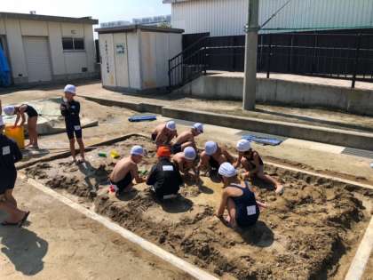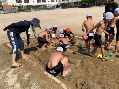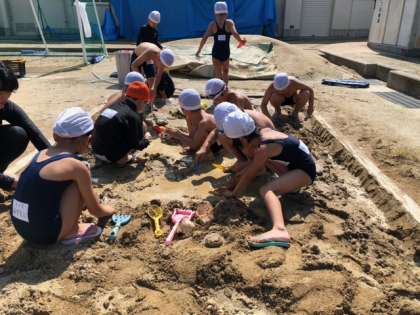 子どもたちは水着に着替えてプールではなく、その前に砂場に向かいました!