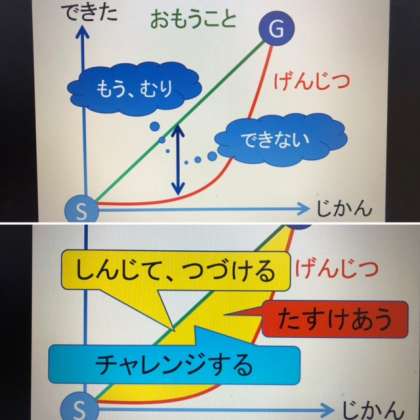 この話は昨年度もした話です。自転車に初めからスイスイ乗ることのできた人はいません。最初は何度もこけて、痛い思いをしながらも、めげずにやり続けたこと。そして、1人ではなく誰かの力を借りてやり続けたこと。そんな努力の積み重ねで、ある時、スッと乗ることのできる瞬間に出会えるのです。