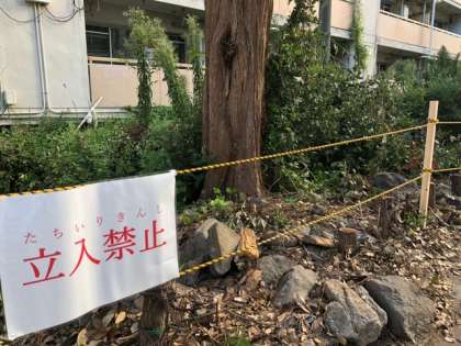 学校の北側に位置する市営住宅の移転が今夏で終了しました。それにともない、周辺の歩道に面した植え込みの撤去が始まっています。立ち入り禁止の看板とロープが張られていますが、歩道との境が無くなっていますので、みなさま十分にご注意ください。子どもたちにも気をつけるように伝えています。